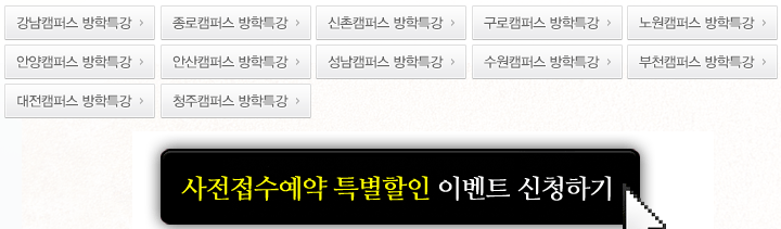 하이미디어 [이벤트]여름방학특강 사전접수 할인 이벤트 Post. 2013.05.29 여름방학특강 사전접수이벤트 이벤트 기간내에 사전접수 하시면 7만원 할인쿠폰(최대50%할인)를 SMS문자로 받으 실 수 있습니다.