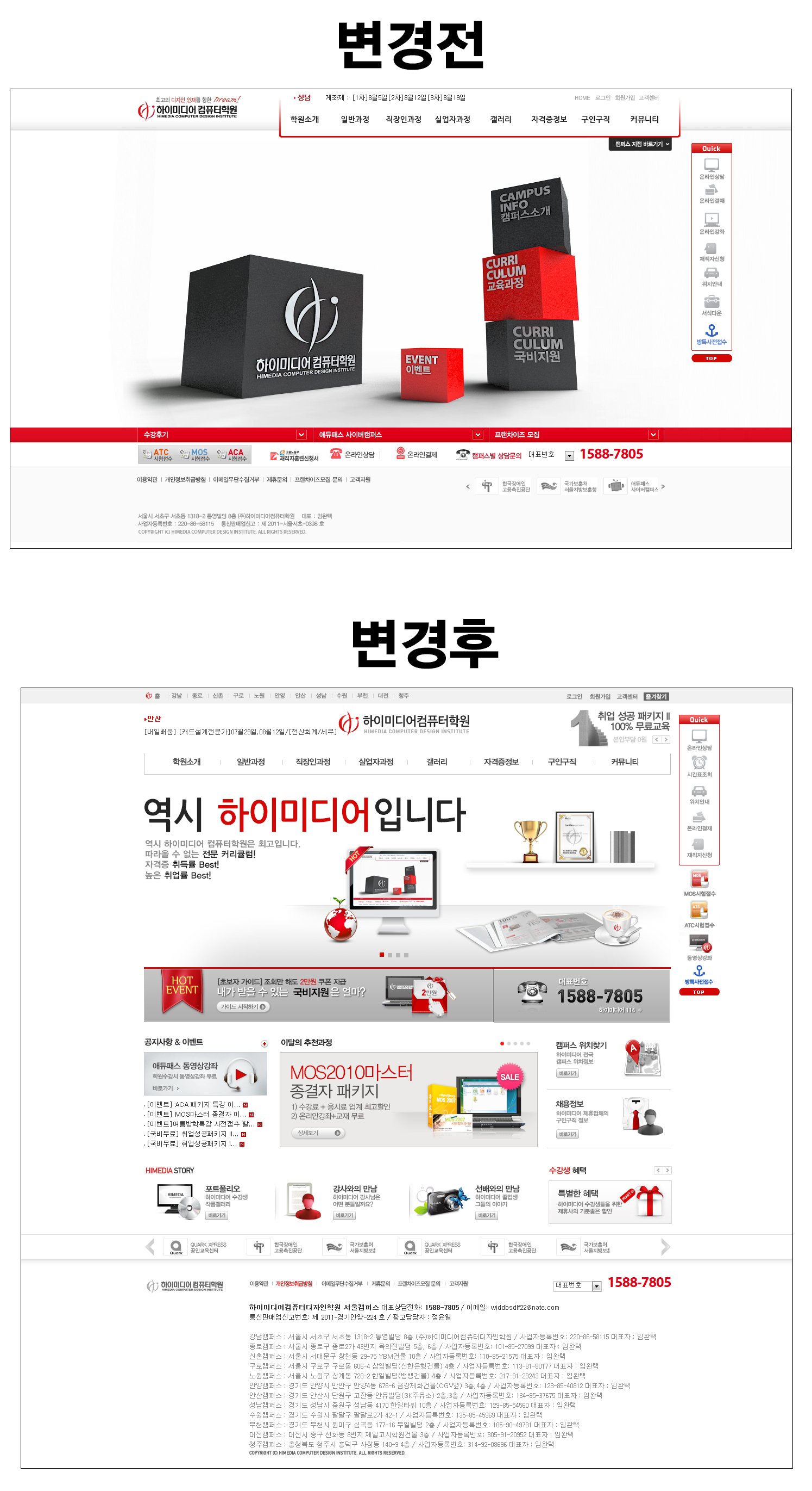 하이미디어 [공지] 사이트 개편관련 안내 Post. 2013.07.24 안녕하세요 빛나는 수강생 여러분! 여름을 맞이하여 저희 하이미디어 컴퓨터학원이 부분 개편되었습니다. 이전 수강생분들의 갑작스런 변경에따른 혼란을 줄이고자 아래 사전오픈 일정동안 한시적으로 이전사이트와 개편된사이트를 소개할 계획입니다. 사전오픈일정 8-3(토) ~ 8-4(일) 실시됨 8-9(금) 오전10시~ 오후7까지 실시됨 8-12(월) 오전10 오픈완료 기존 사용하시던 메뉴들 모두 변경없이 사용하실 수 있도록 하였습니다. 개편후 더욱 더 좋은 모습으로 찾아뵐수 있도록 항상 열심히 노력하는 하이미디어가 되겠습니다. 감사합니다.