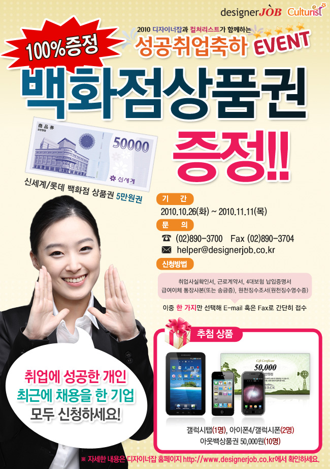 하이미디어 [종료] 성공취업축하 EVENT Post. 2010.11.10 - 신청방법 : 취업사실확인서 ,근로계약서, 4대보험 납입증명서, 급여이체 통장사본(또는 송금증), 원천징수조서 (이중 한가지만 선택하여 E-mail 또는 FAX로 간단히 접수) - EVENT 상품 : 지원자 전원 백화점 상품권(신세계/롯데 5만원권) 추첨상품 - 갤럭시탭(1명), 아이폰4/갤럭시S(2명), 아웃백상품권 5만원권(10명) - 문의 : TEL 02-890-3700 / FAX 02-890-9704 / E-mail - helper@designerjob.co.kr - 기타 자세한 사항은 디자이너잡 홈페이지참조(http://www.designerjob.co.kr/)