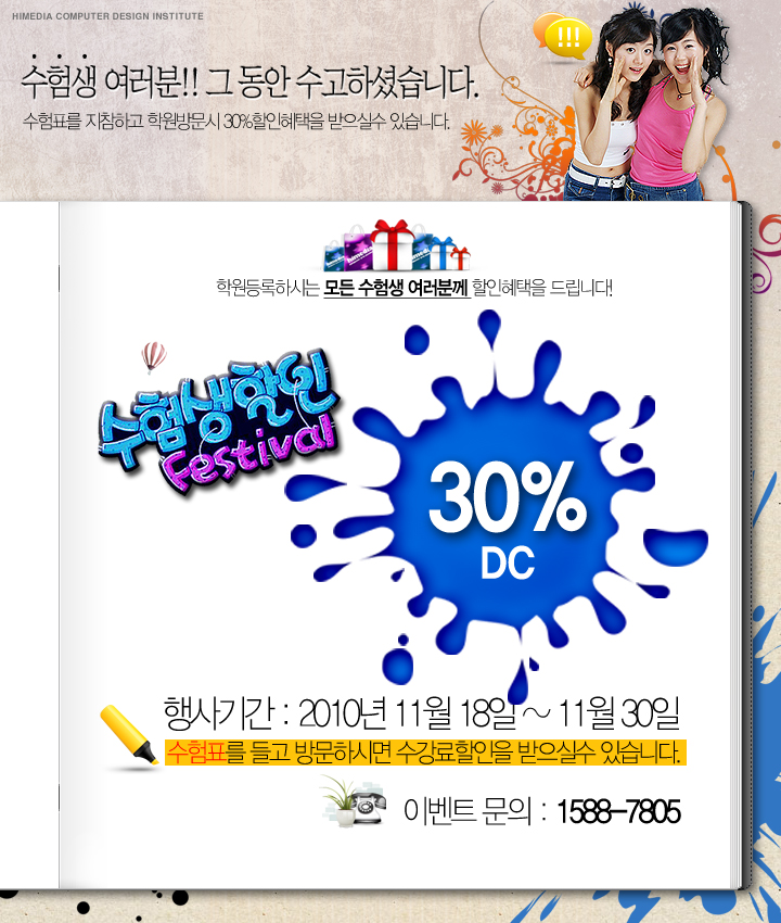 하이미디어 [종료] 수험생 특별할인 이벤트 Post. 2010.11.18 수험생 여러분!! 그동안 수고하셨습니다. 수험표를 지참하시고 이벤트 기간내에 접수 하시면 30%추가 할인의 혜택을 받으 실 수 있습니다.