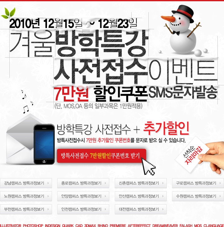 하이미디어 [종료] 겨울방학특강 사전접수이벤트 Post. 2010.11.19 겨울방학특강 사전접수이벤트 이벤트 기간내에 사전접수 하시면 7만원 할인쿠폰를 SMS문자로 받으 실 수 있습니다.